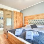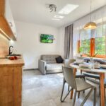 Jasny, przytulny apartament o powierzchni 32 m kw. dla 3 lub 4 osobowej rodziny. Posiada sypialnię z łóżkiem królewskim 160 x 200 cm, a w przestronnej kuchni dodatkową rozkładaną sofę o wymiarach 110 x 200 cm. Każde łóżko posiada bardzo wygodny materac. W apartamencie znajduje się też łazienka z prysznicem. Goście mogą również korzystać z balkonu z zestawem mebli wypoczynkowych.